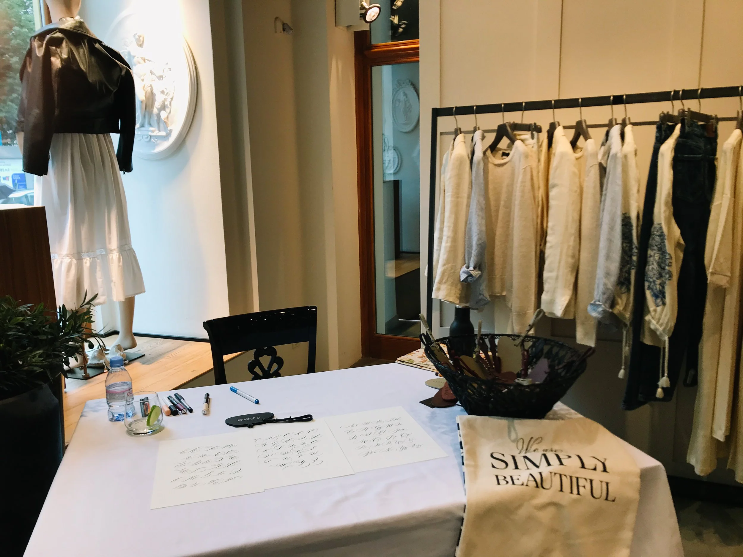 I collaborated several times as a guest calligrapher at Max Mara Boutique, creating personalized signage and unique gifts for customers. I wrote on silk scarves, tote bags, or leather keychain and also personalized stationery, especially for Christmas gifts.